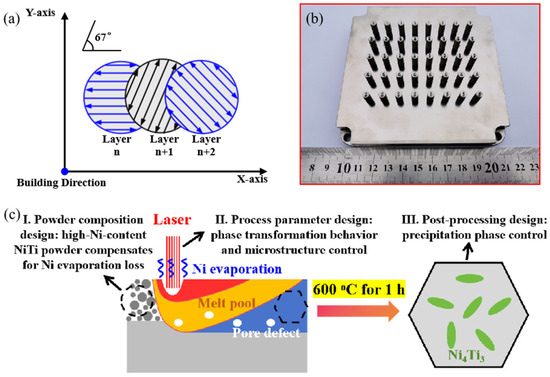 NiTi shape memory alloys, as a special functional material, exhibit outstanding superelasticity, shape memory effect, thermoelastic properties, and biocompatibility. They have a wide range of applications in aerospace, sensing and actuation, solid-state refrigeration, medical devices, and other fields [1,2,3,4,5]. However, NiTi alloys exhibit accelerated tool wear during machining due to work hardening, and they are prone to forming brittle precipitate phases during welding. Consequently, conventional machining methods struggle to fabricate NiTi components with complex geometries [6]. In recent years, laser powder bed fusion technology has advanced rapidly. Utilizing a high-energy laser as the heat source, it melts the powder layer by layer along a predetermined path, providing an effective approach for fabricating complex NiTi components [7,8,9,10].