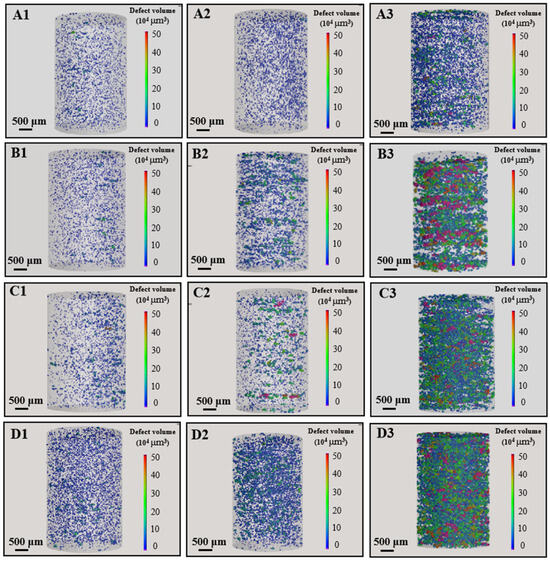 Micro-CT results of Ni51.9Ti48.1 alloys fabricated using different processing parameters: (A1–A3) The laser power is 190 W, and the scanning speeds are 700, 600, and 500 mm/s, respectively; (B1–B3) The laser power is 170 W, and the scanning speeds are 600, 500, and 450 mm/s, respectively; (C1–C3) The laser power is 150 W, and the scanning speeds are 550, 500, and 400 mm/s, respectively; (D1–D3) The laser power is 130 W, and the scanning speeds are 500, 400, and 350 mm/s, respectively.