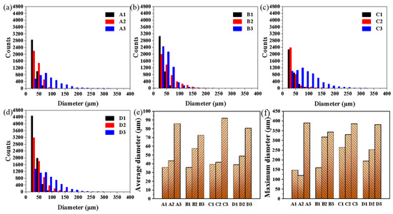 The pore defect counts and diameter distribution in Ni51.9Ti48.1 alloys prepared using different parameters: (a) Samples A1, A2, and A3; (b) Samples B1, B2, and B3; (c) Samples C1, C2, and C3; (d) Samples D1, D2, and D3; (e) The average diameter of defects in different samples; (f) The maximum diameter of defects in different samples.