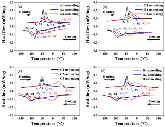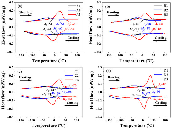 DSC curves of LPBFed Ni51.9Ti48.1 alloys after annealing at 600 °C: (a) Samples A1, A2, and A3; (b) Samples B1, B2, and B3; (c) Samples C1, C2, and C3; (d) Samples D1, D2, and D3.