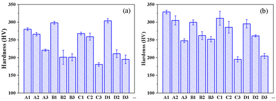 Figure 7 shows the room-temperature hardness of LPBFed Ni51.9Ti48.1 alloys before and after annealing at 600 °C. It can be observed that, within groups sharing the same laser power, hardness gradually decreases with increasing energy density. This is attributed to the higher phase transformation temperature of Ni51.9Ti48.1 alloys printed at high energy densities, which reduces the difficulty of inducing stress-induced martensitic transformation. Additionally, larger porosity defects in samples fabricated at high energy densities also contribute to the hardness reduction. For the Ni51.9Ti48.1 alloy after annealing, its hardness trend is similar to that before annealing; however, the hardness is significantly increased. This enhancement can be attributed to the formation of precipitated phases such as Ni4Ti3 during annealing, which contribute to precipitation hardening. Among all samples, the annealed A1 sample demonstrates the highest room-temperature hardness of 328.8 HV, a value comparable to that of as-cast NiTi alloys.