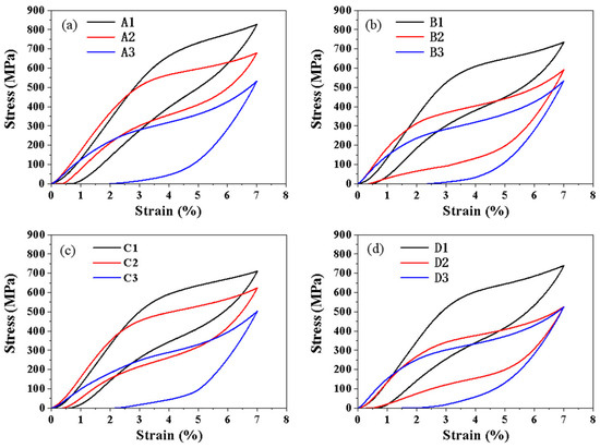 Stress–strain curves of annealed Ni51.9Ti48.1 alloys at room temperature: (a) Samples A1, A2, and A3; (b) Samples B1, B2, and B3; (c) Samples C1, C2, and C3; (d) Samples D1, D2, and D3.