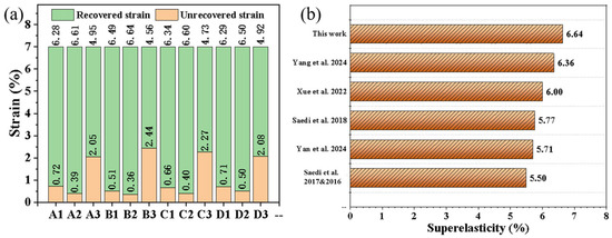 (a) Recovered strain and unrecovered strain of annealed Ni51.9Ti48.1 alloys after unloading; (b) Comparison of the superelasticity obtained in this work with other reported results (adapted from Refs. [17,19,20,21,22,24]).