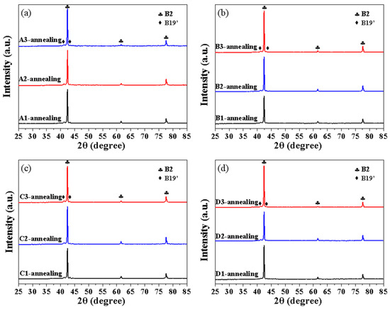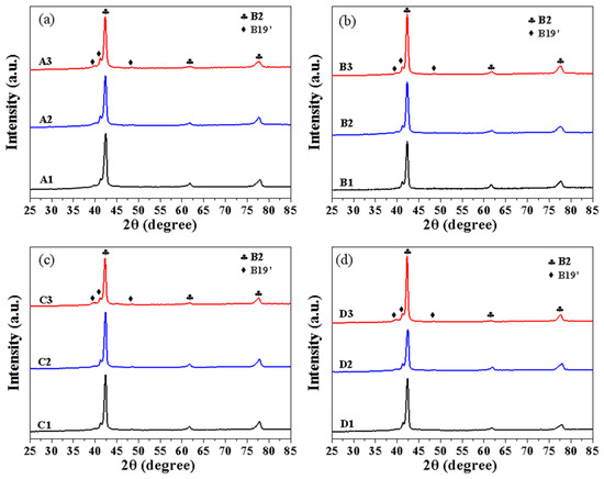 XRD patterns of Ni51.9Ti48.1 alloys after annealing at 600 °C: (a) Samples A1, A2, and A3; (b) Samples B1, B2, and B3; (c) Samples C1, C2, and C3; (d) Samples D1, D2, and D3.