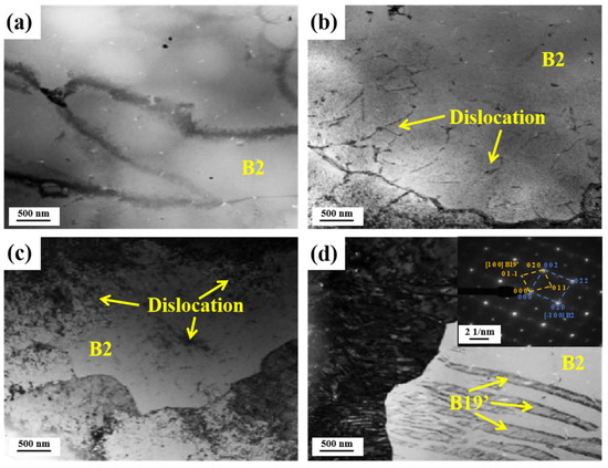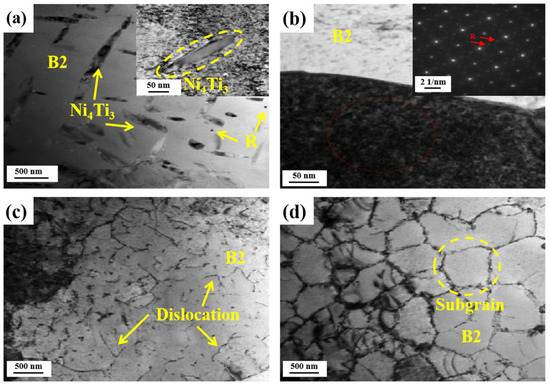 Figure 12 shows the TEM images of the LPBFed Ni51.9Ti48.1 alloys processed under different processing parameters. For the LPBFed A2 sample, the matrix is observed to be B2 austenite with a BCC crystal structure, consistent with DSC and XRD results. Additionally, a small number of dislocation defects are distributed in the B2 matrix of the LPBFed A2 sample (Figure 12b). With the increase in energy density, the LPBFed A3 sample exhibits a denser dislocation network within its B2 austenite matrix (Figure 12c), accompanied by the formation of B19′ martensite plates (Figure 12d). Figure 13 shows the TEM images of the LPBFed Ni51.9Ti48.1 alloys after annealing at 600 °C. For the annealed A2 sample, the matrix remains B2 austenite, but additional lens-shaped Ni4Ti3 precipitates and circular R-phase particles have formed. In contrast, for the annealed A3 sample, dislocation clustering in the B2 matrix has led to the formation of subgrains.