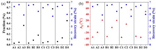(a) The relationship between the volume fraction of pore defects and recovery strain for the LPBF-fabricated Ni51.9Ti48.1 samples; (b) the relationship between the austenitic transformation temperature (Af) and recovery strain for the LPBF-fabricated Ni51.9Ti48.1 samples.