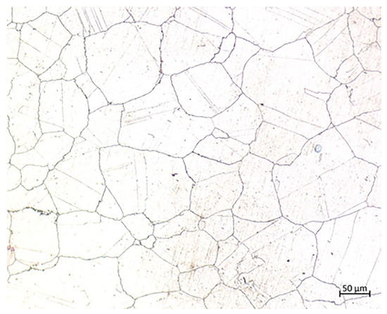 Figure 1 is a schematic diagram of the hot compression process of Inconel 617 alloy samples. The Inconel 617 alloy cylindrical specimen with an initial size of Φ8 mm × 12 mm was selected for hot compression. After 60% high-temperature compression deformation, the sample shows a typical drum shape, the size in the diameter direction becomes larger, and the longitudinal size becomes smaller. However, due to the non-uniformity of deformation, the actual size in the diameter direction is relatively irregular, which is caused by the friction between the sample and the indenter and the uneven flow of the metal during the deformation process. Subsequently, wire cutting was performed along the longitudinal section of the compression shaft to observe and analyze the evolution of its microstructure. Figure 2 shows the original microstructure of the Inconel 617 alloy. It can be seen that the original microstructure of the material is basically equiaxed grains of different sizes before compression.