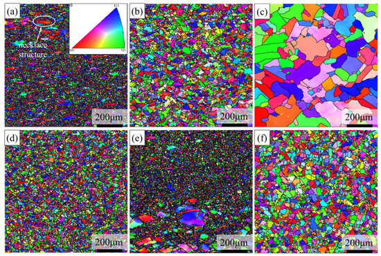 Inversed pole figure (IPF) map of strain rates of 0.001 s−1 and 0.1 s−1 at different temperatures: (a) 1000 °C-0.001 s−1, (b) 1100 °C-0.001 s−1, (c) 1200 °C-0.001 s−1, (d) 1000 °C-0.1 s−1, (e) 1100 °C-0.1 s−1, and (f) 1200 °C-0.1 s−1.