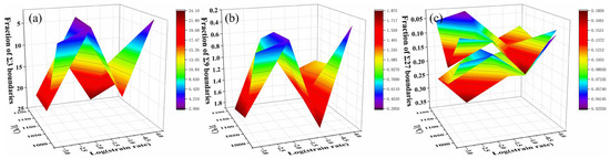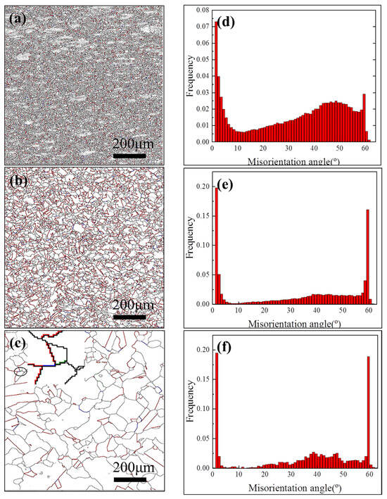 Figure 4 shows the grain boundary distribution and grain orientation angle at different temperatures. Black represents high-angle grain boundaries (HAGB > 15°), gray represents low-angle grain boundaries (LAGB < 15°), red is Σ3, blue is Σ9, and green is Σ27. Σ3 describes the orientation relationship of two grains rotating 60° around a common <111> axis. It is the most important and common special grain boundary. The grain boundary energy is very low, and the structure is highly ordered. When two Σ3 grain boundaries meet, they can react to form a Σ9 grain boundary. The grain boundary energy is higher than Σ3, but it is still much lower than the random HAGB. A Σ3 grain boundary and a Σ9 grain boundary meet, which can further react to form a Σ27 grain boundary. The grain boundary energy is higher than Σ9, but it still belongs to the category of “special grain boundary”, and its performance is between Σ9 and random HAGB. The higher the order degree of the structure is, the lower the grain boundary energy is. It can be seen from Figure 4 that the grain boundaries are relatively sensitive to temperature at a low strain rate of 60% deformation. As the temperature increases, the HAGBs first decrease and then increase, while the LAGBs increase and then decrease. It can be seen from Figure 4d–f that the grain boundary frequency distribution diagram gradually moves toward a bimodal distribution, which indicates that as the temperature increases, some LAGBs gradually transform into HAGBs, as shown in Figure 5, which promotes the occurrence of the DRX process. The generally accepted explanation is that the DRX processes depend on the migration of the HAGB to eliminate the deformed structures. This promotes the DRX at high temperatures, and the interfacial energy of the HAGB was higher.