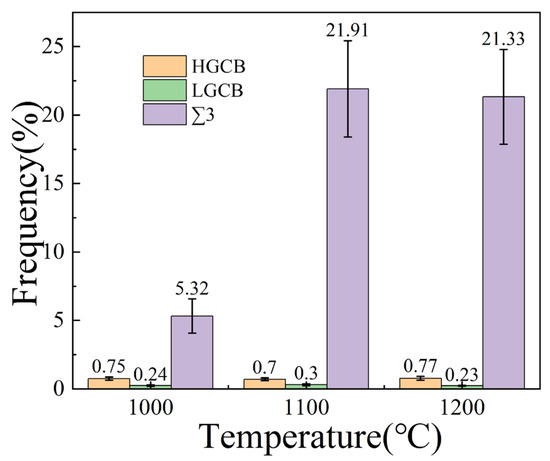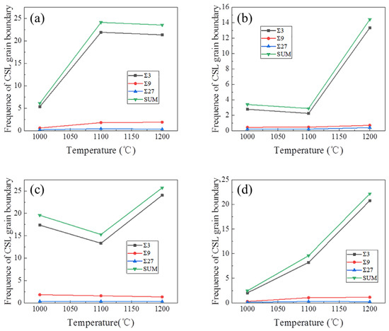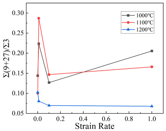 Figure 8a shows the effect of temperature on the ratio of Σ3 grain boundaries at a strain rate of 0.001 s−1. With increasing temperature, the total Σ CSL proportion rose sharply at first and leveled off at 1100 °C. The peak value was at 1100 °C, and the trend was the same as that of Σ3. However, the variation range of Σ9 and Σ27 is small, and Σ9 generally shows a trend of increasing first and then stabilizing. When the strain rate was 0.01 s−1, the total Σ CSL grain boundary proportion was opposite that of 0.001 s−1, showing a slow decline and then a sharp rise. When the peak value appeared at 1200 °C, the change range of Σ9 and Σ27 was even smaller. When the strain rate was 0.1 s−1, the general trend was the same as that of 0.01 s−1, but the range decreased to a certain extent. When the peak value was still at 1200 °C, Σ9 showed a downward trend. When strain rates ranged from 0.001 s−1 to 0.1 s−1, the total Σ CSL showed a downward trend, which was because the DRX had enough time to grow up at low strain rates, while the increase was due to the adiabatic temperature rise effect. When the strain rate was 1 s−1, the total Σ CSL and Σ3 showed a completely different trend from the previous one, an upward trend, while Σ9 and Σ27 showed little change. This indicates that at high strain rates, with increasing temperature, the formation of special grain boundaries is favorable, which is also the effect of DRX.