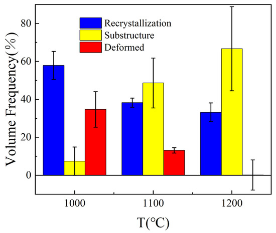 Figure 6 shows the grain size distribution at different temperatures under low strain rates. Blue represents the proportion of DRX, yellow represents the substructure, and red represents the deformed grain. It can be seen from the figure that at low strain rates, with increasing temperature, the recrystallization degree decreases relatively, and the deformed grain greatly decreases. When it reaches 1200 °C, there is hardly any deformed grain, only a few tenths of a percent, while the proportion of the substructure continuously increases. This indicates that temperature has no promotion effect on the recrystallization process at low strain rates but has a great promotion effect on the substructure formation. At 1000 °C, the proportion of recrystallization grain ratio and deformation are the largest, and DRX occurs. With increasing temperature, the deformation grain percentage gradually decreases and the DRX grain grows up. At 1100 °C, isometric crystal grains grow, but under conditions of the recrystallization grain boundary, serious arching occurs into the neighboring grain. This is associated with the rapid migration of the twin, and due to the low deformation rate, deformation and high temperature play a major role in the process. At 1200 °C, it is even more obvious. The remaining grains continue to undergo DRX, and the increase in the substructure indicates that CDRX occurs in this process. The subgrain boundary makes the difference in orientation continuously increase through continuous torsion, so as to produce new grains.