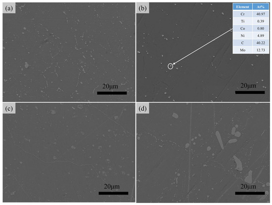 SEM micrography and EDS element mapping results: (a) 0.001 s−1, 1000 °C, (b) 0.001 s−1, 1100 °C, (c) 0.001 s−1, 1200 °C, and (d) 0.1 s−1, 1100 °C.