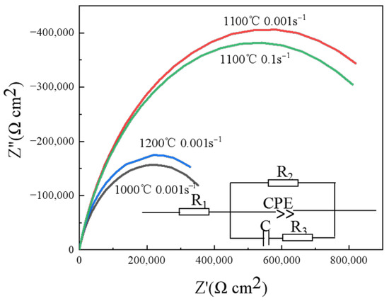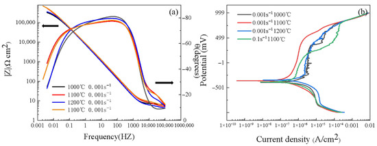 The Bode diagrams and polarization curves under different conditions are shown in Figure 11. It can be seen that the curves are basically the same, except at 1000 °C-0.001 s−1 and 1200 °C-0.001 s−1; when the frequency is between 0.01 Hz and 0.1 Hz, there is a big difference in Z. This indicates that the passivation films on the surface of these two samples are more likely to allow charge transfer than those on the other two samples. The general trend of the polarization curve is consistent with that described in the literature. The current density at some positions on the anode curve decreases with the increase in the potential, indicating that passivation occurs and a dense oxide film is generated, which blocks the ion diffusion and leads to the decrease in the corrosion current density. By analyzing along the X axis, it can be found that the self-corrosion current density first decreases and then increases with the increase in temperature. By analyzing along the Y axis, the self-corrosion potential increases with the increase in temperature. At the same temperature, the self-etching current density increases with the increase in strain rate.