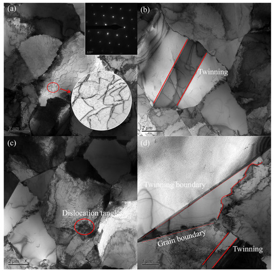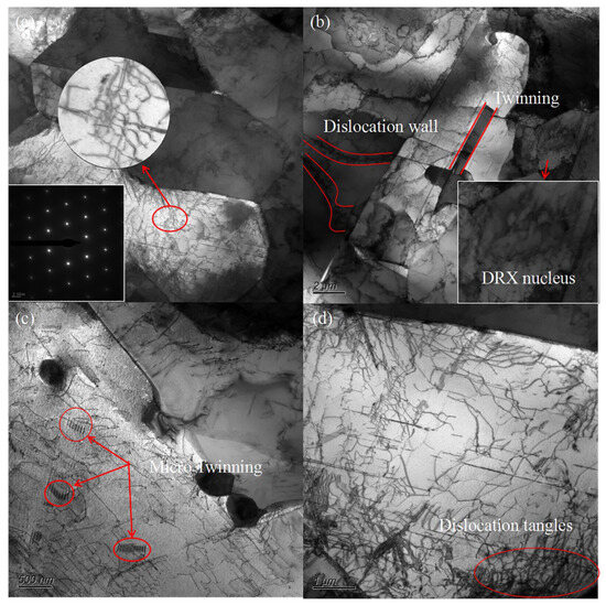 TEM bright field images of Inconel 617 alloy at 1100 °C 0.001 s−1: (a) Matrix diffraction spot, (b) twins and dynamic recrystallization nucleation, (c) micro-twin, and (d) dislocation tangles.