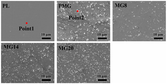 Figure 1 shows the surface morphology of different samples. The surface of the PL sample was very flat, and there were white particles attached to the PLGA coating on the surface of the other samples. The number of particles increased with the increasing addition of Mg(OH)2. According to EDS results in Table 2, the contents of Mg and O in the particles were much higher than those in the PLGA coating.