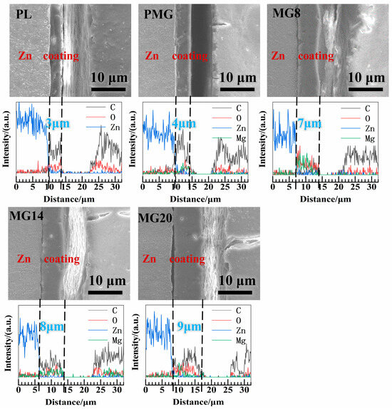 SEM images of the cross-sections and EDS line scanning of different samples.
