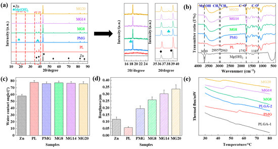 Figure 3c shows the water contact angle of the samples. The water contact angle of Zn was about 57°, and that of the coated samples was close to 80°. The PLGA coating increased the water contact angle, but the addition of Mg(OH)2 did not change the water contact angle.