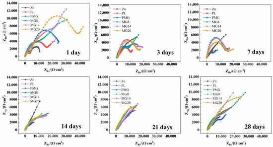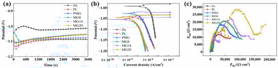 Figure 4 shows the electrochemical performance of the samples. The open-circuit potential of the Zn sample initially increased, then decreased, and finally stabilized at a relatively high value. The open-circuit potential of the coated samples first decreased and then increased slightly. In Figure 4b, the corrosion current density (icorr) of the samples with coating decreased significantly, and the icorr of the samples with double-layer coating was lower than that of the samples with single-layer coating. In Figure 4c, the capacitance arc diameter of the samples with coatings was larger than that of the Zn sample, and the capacitance arc diameter of the samples with double-layer coating was larger than that of the single-layer coating. Among the double-layer coating samples, the capacitance arc diameter increased with the increasing content of Mg(OH)2.
