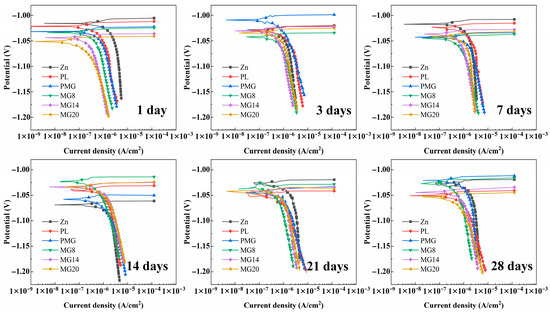 Figure 5 shows the potentiodynamic polarization curves of samples after immersion for different durations. The corrosion current density of the samples with a single-layer coating was higher than that of Zn at 7 and 14 days. For the samples with a double-layer coating, the corrosion current density was lower than that of Zn, except on the 14th day.