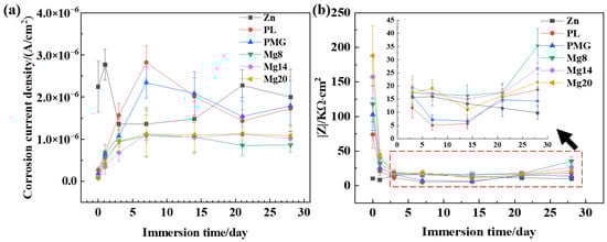 Figure 7 shows the changes in the electrochemical performance of the samples during immersion. The corrosion current density of the samples with double-layer coatings was lower than that of the Zn sample, especially during the first 7 days. The corrosion current density of the samples with single-layer coatings was slightly higher than that of Zn sample on the 7th and 14th days. The impedance modulus of the samples with double-layer coatings decreased significantly within the first 3 days but remained higher than that of the Zn sample throughout the immersion process. In contrast, the impedance modulus of the single-layer coated samples did not consistently stay higher than that of the Zn sample. When the immersion time increased from 21 days to 28 days, a sudden increase in corrosion resistance was observed for the composite coating samples. It could be because corrosion products formed with the increase in immersion time, and the corrosion products sealed the holes of the composite coating. The above results indicate that the electrochemical performance of the coated samples was better than the Zn sample, and the protective effect of the double-layer coatings was better than that of the single-layer coatings.