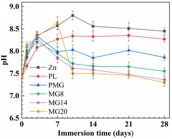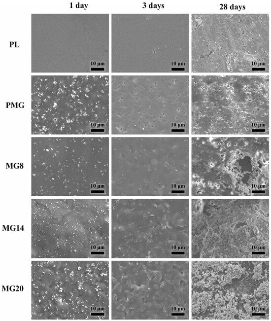 Figure 8 shows the microstructure of the samples after immersion. After immersion, no change was observed on the surfaces of PL and MG8 samples. On PM sample, Mg(OH)2 partially dissolved, and a few holes were left on the surface. On MG14 and MG20 samples, pits formed on the site of Mg(OH)2, but no holes were generated, while there were more pits and less Mg(OH)2 on the surface of the MG20 sample compared to the MG14 sample. After 3 days of immersion, holes appeared on the surface of the PL sample, and most of the Mg(OH)2 on the surface of the other samples had dissolved. With the increase in Mg(OH)2 content, more and larger pits formed on the surface of the samples with double-layer coating. After 28 days of immersion, more and larger holes were formed on the surfaces of PL and PM samples compared to the third day, but the holes on the PL sample were unevenly distributed. The outer coating of the MG8 sample had partially degraded, forming large holes. Most of the outer coating on the surface of MG14 sample had degraded, and the outer coating on the surface of MG20 sample had almost completely degraded, leaving only some residues on the surface. The pits on the coating could be formed due to two reasons. The first one is that the Mg(OH)2 particles dissolved in the solution directly. The second one is that the Mg(OH)2 particles detached from the coating because of loss of attachment from the PLGA, which undergoes hydrolysis during immersion. In a word, the added Mg(OH)2 resulted in more defects in the coating, which accelerated the degradation of coatings.