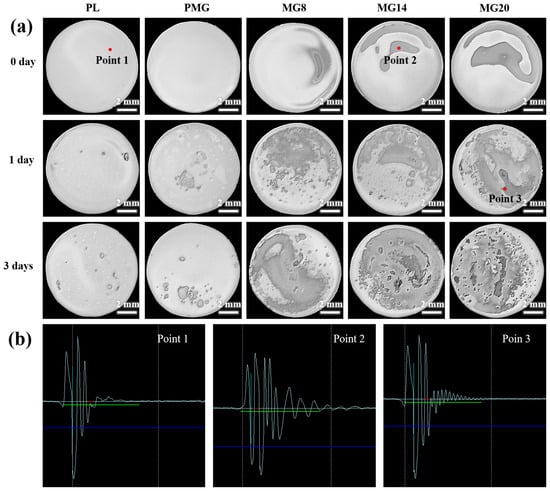 Figure 10b shows the sound wave diagrams of the samples. At point 1, the waveform indicated no attenuation of the sound wave, suggesting the absence of gas or significant defects, as sound waves typically attenuate when passing through gas. Moving to point 2, a noticeable attenuation in the sound occurred, signifying the presence of minor defects. This attenuation became more pronounced at point 3, suggesting further deterioration of the coating, possibly due to increased defects or gas accumulation. The above results indicate that the addition of Mg(OH)2 increased the internal defects of the coating and accelerated the degradation of the coating.