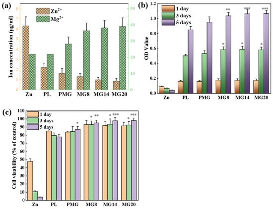 Ion concentration of the 1-day extracts (a). OD values of MC3T3-E1 cultured in the 1 day extracts (b) for 1 day, 3 days, and 5 days. Cell viability of MC3T3-E1 cultured in the 1 day extracts (c) for 1 day, 3 days, and 5 days. * p < 0.05, ** p < 0.01, *** p < 0.001 vs. PL.