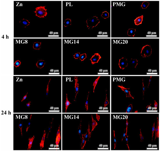 Images of MC3T3-E1 cells stained by phalloidin/DAPI after cultivation for 4 h and 24 h.
