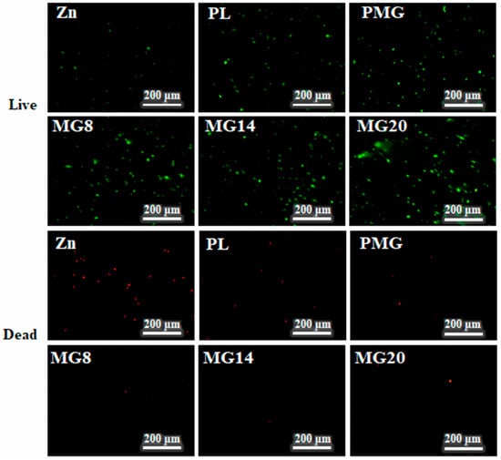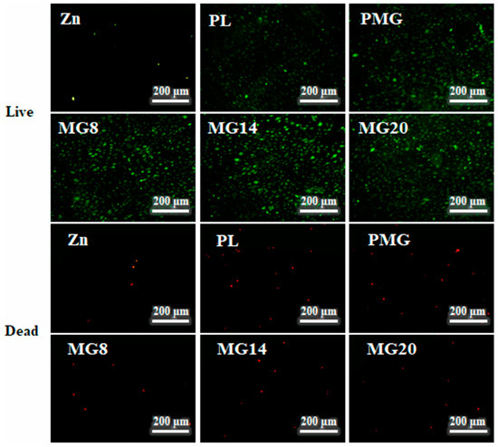 Figure 11a shows ion concentration of the 1-day extracts. After 1 day of extraction, the Zn2+ concentration released from the Zn sample was about 6.3 μg/mL. The single-layer PL coating significantly reduced Zn2+ concentration to about 2 μg/mL, while the double-layer further reduced it to about 1 μg/mL. Zn2+ concentration decreased slightly with the increase in Mg(OH)2 content. The Mg2+ concentration in the initial medium was about 22 μg/mL. The Mg(OH)2-containing single-layer (PMG sample) increased Mg2+ concentration to 27 μg/mL, while the double-layer containing coating significantly increased Mg2+ concentration to about 40 μg/mL. In addition, the Mg2+ concentration increased with the increase in Mg(OH)2 content in the coating.
