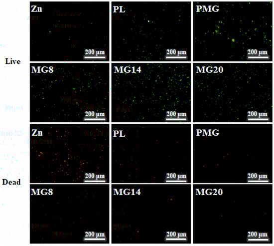 Figure 13 shows images of live–dead MC3T3E1 cells after 1 day of cultivation. After 1 day of culture, the number of living cells on the Zn sample was less than that on the coated samples, but the number of dead cells was much higher than that on the coated samples. The number of dead cells on the samples with single-layer coating was slightly higher than that on the samples with double-layer coating.