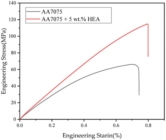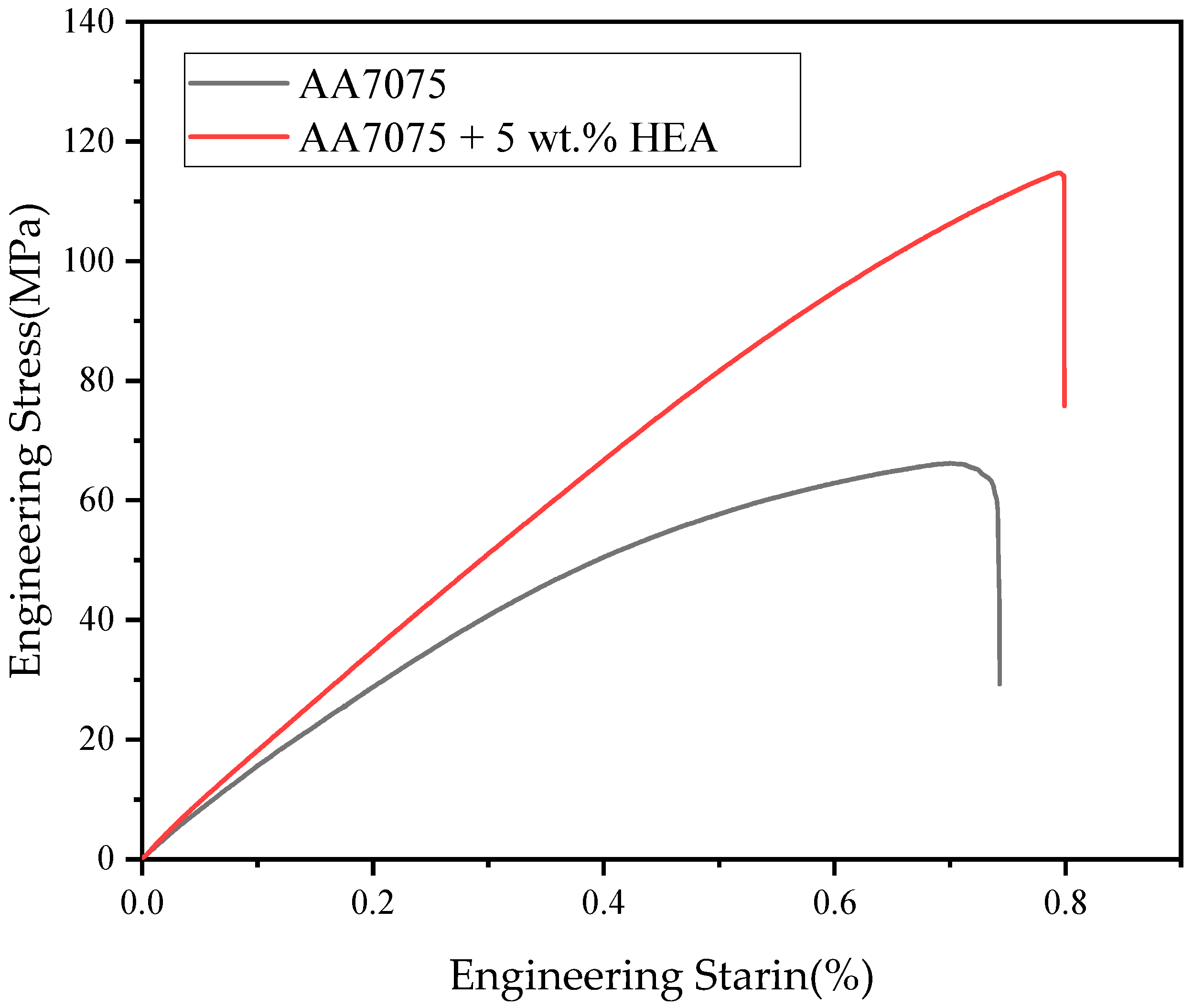 | AA7075 +5 wt.% HEA | 97.09 ± 0.84 | 157.10 ± 7.51 | 120.21 ± 5.79 | 0.81 ± 0.02 |
