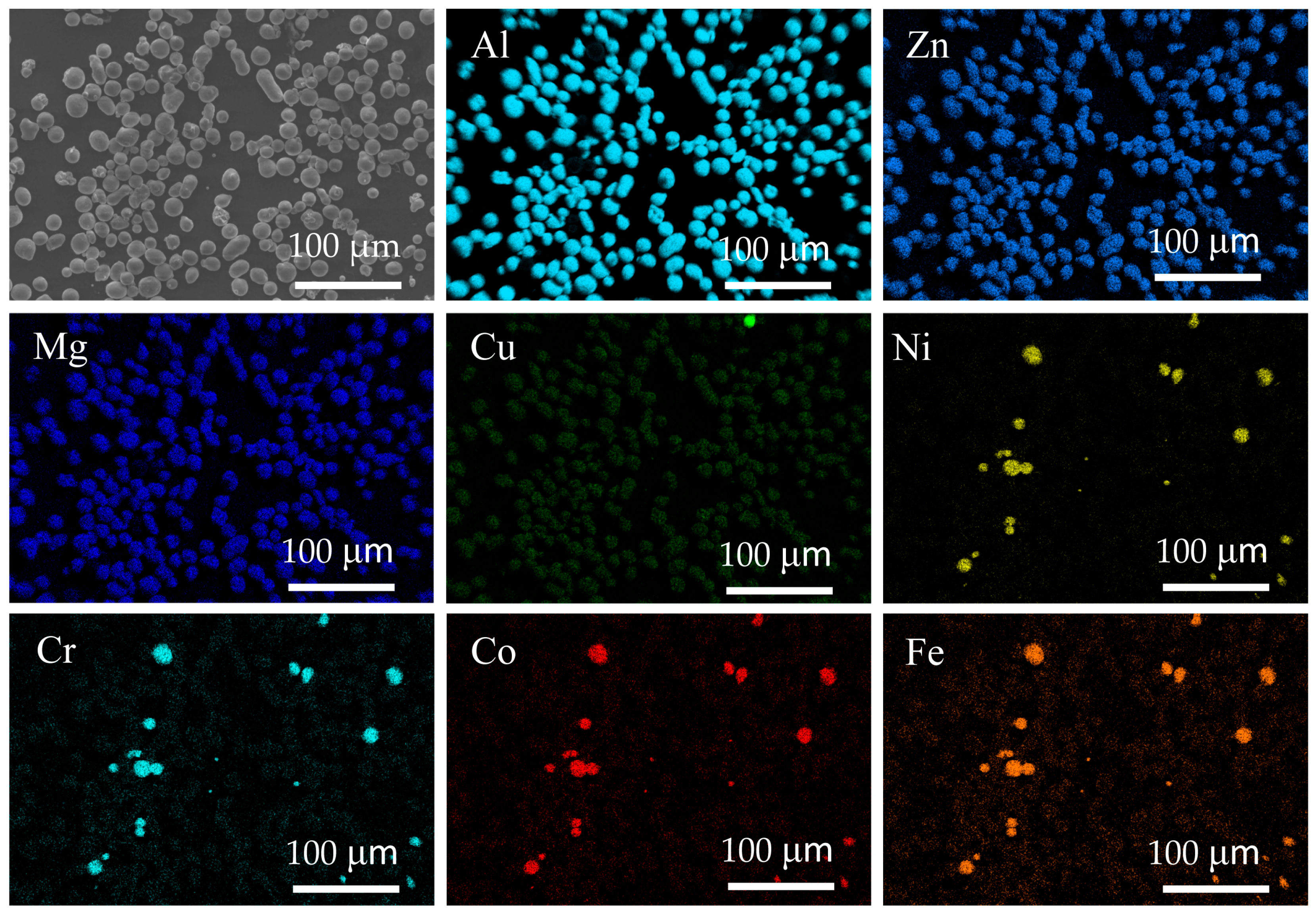 - Zhang, Y.; Li, X.; Gu, H.; Li, R.; Chen, P.; Kong, C.; Yu, H. Insight of High-Entropy Alloy Particles-Reinforced 2219 Al Matrix Composites via the Ultrasonic Casting Technology. Mater. Charact. 2021, 182, 111548. [Google Scholar] [CrossRef]