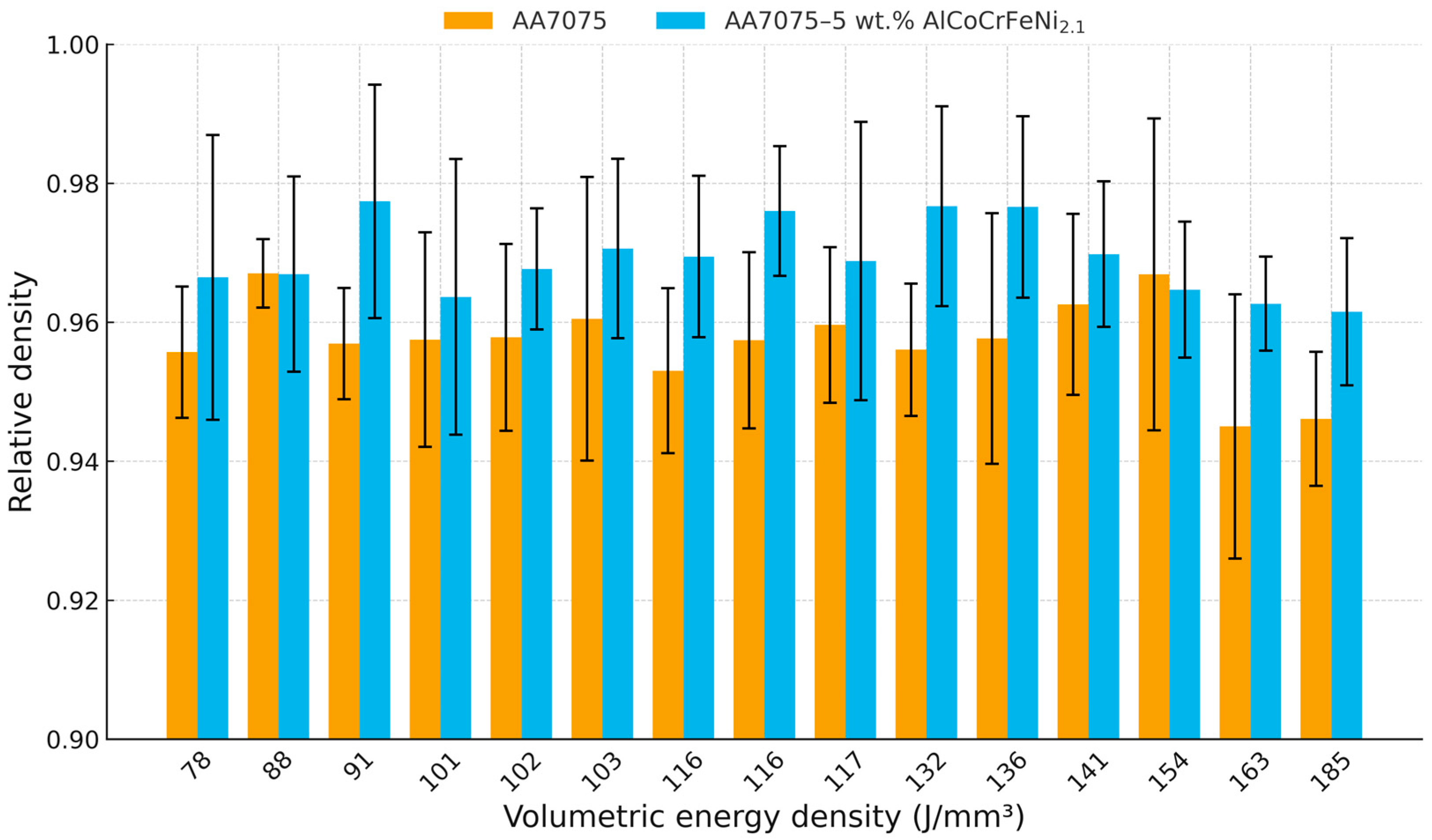 - Densification. With the addition of HEA, the measured relative density increased by about 0.5–1.5% (absolute) over the same parameter sets, increasing from 94.50 to 96.70% (unreinforced) to 96.15–97.74% (HEA-reinforced). The highest values were obtained near the lower-to-medium VED range (e.g., 97.74% at 220 W/900 mm·s−1, VED = 90.53 J·mm−3 for the composite, and 96.70% at 190 W/800 mm·s−1, VED = 87.96 J·mm−3 for the base alloy). Porosity was not eliminated.