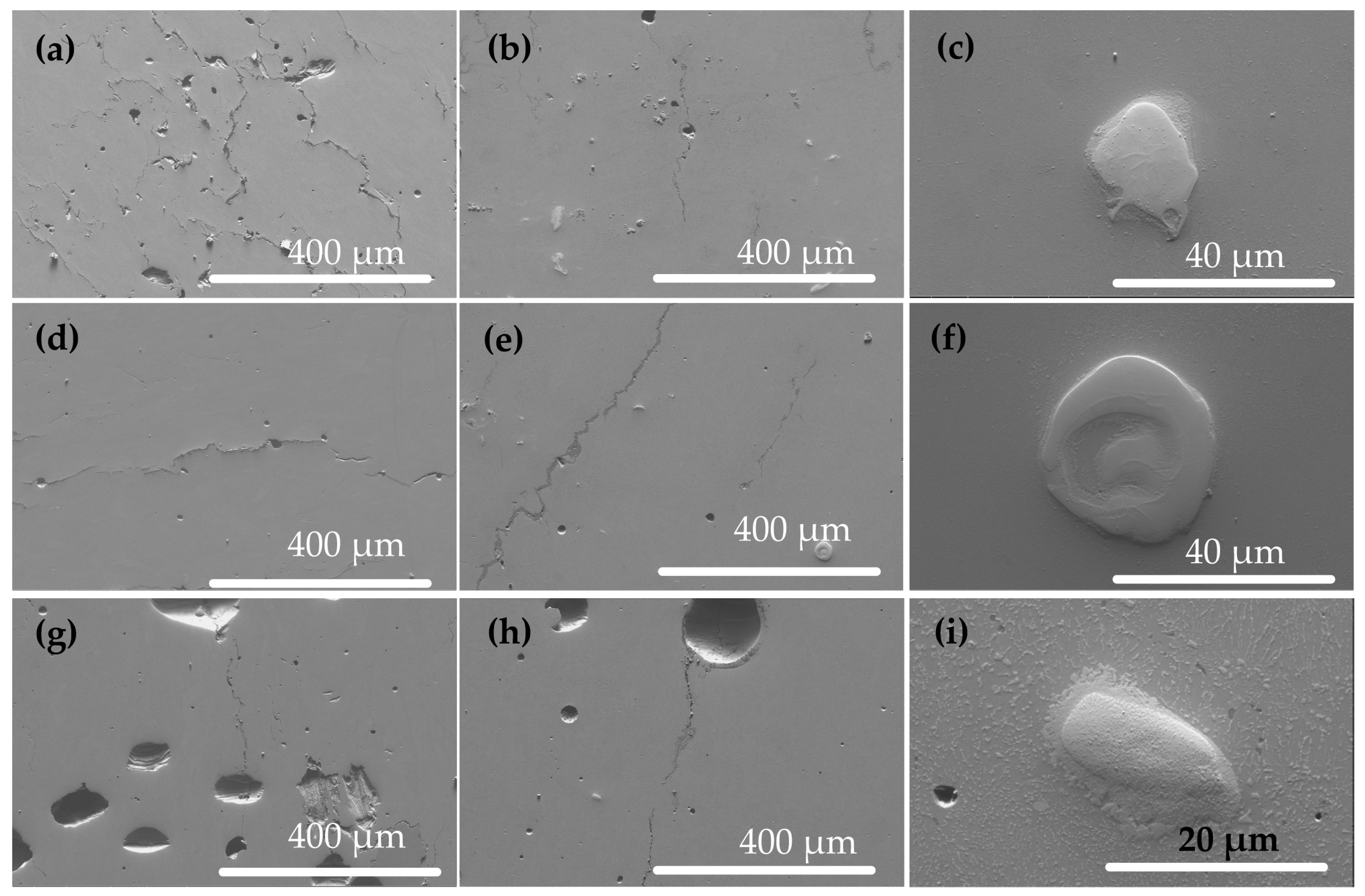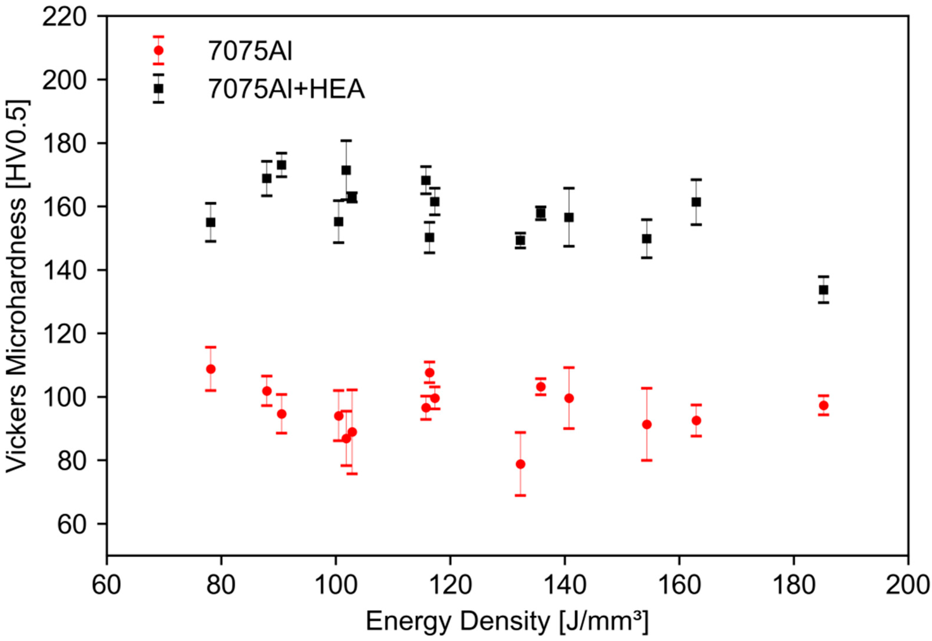 - Cracks and Voids. OM comparisons at 25× (Figure 4) confirmed that adding 5 wt.% HEA modified the failure mode, transforming the long, continuous cracks typical of AA7075 into shorter, deflected ones. Porosity, however, was not eliminated; characteristic lack-of-fusion (LOF) defects persisted at low VEDs, while vaporization-induced near-spherical pores dominated at high VED values.