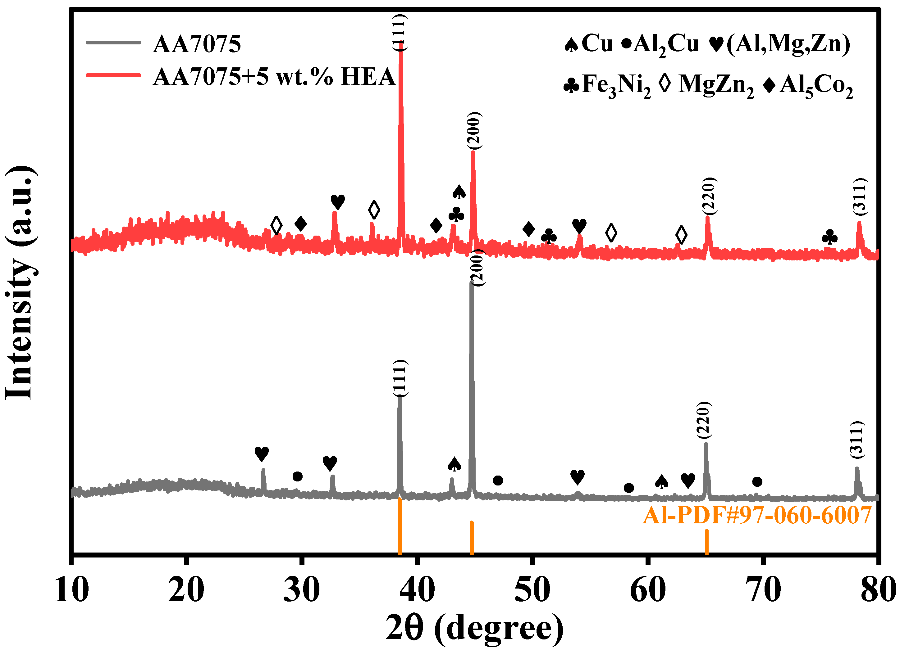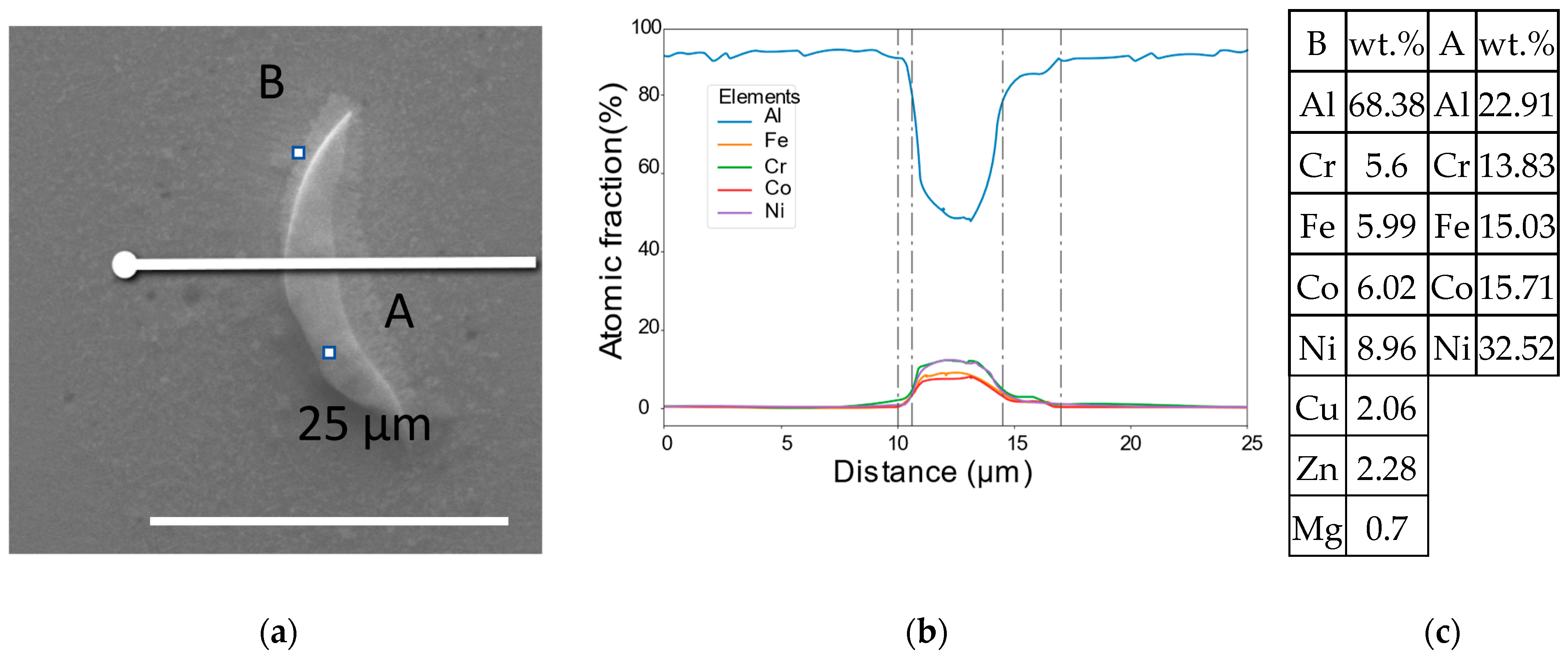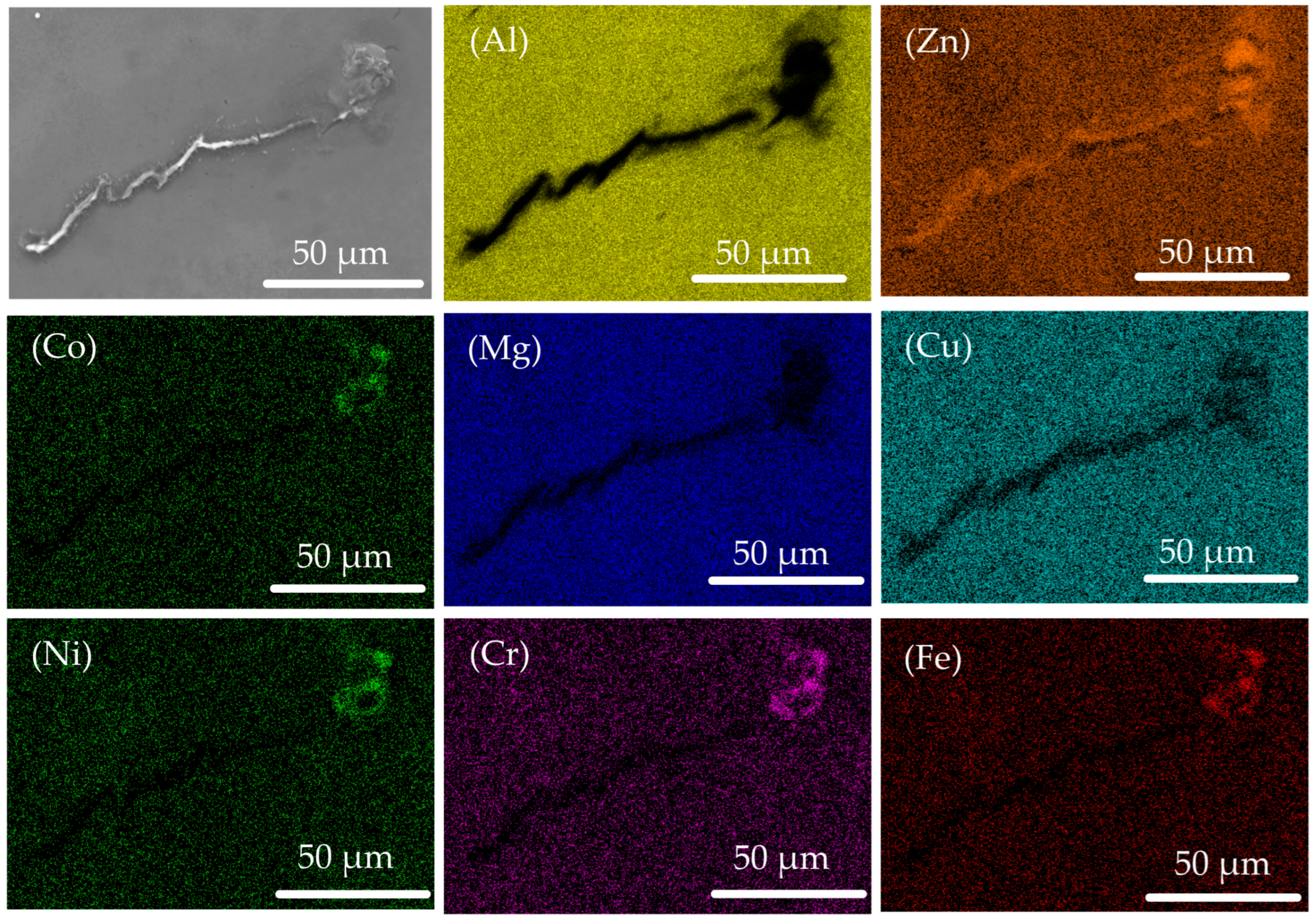 - Elemental redistribution and mechanism insight: EDS mapping showed HEA particles enriched in Fe/Co/Ni/Cr, containing a marked depletion in Zn. In contrast, Zn was segregated linearly along crack paths in the matrix. This redistribution indicated that HEA reinforcement altered the solidification path and solute partitioning, interfering with the metallurgical mechanism underpinning hot cracking in 7xxx alloys.