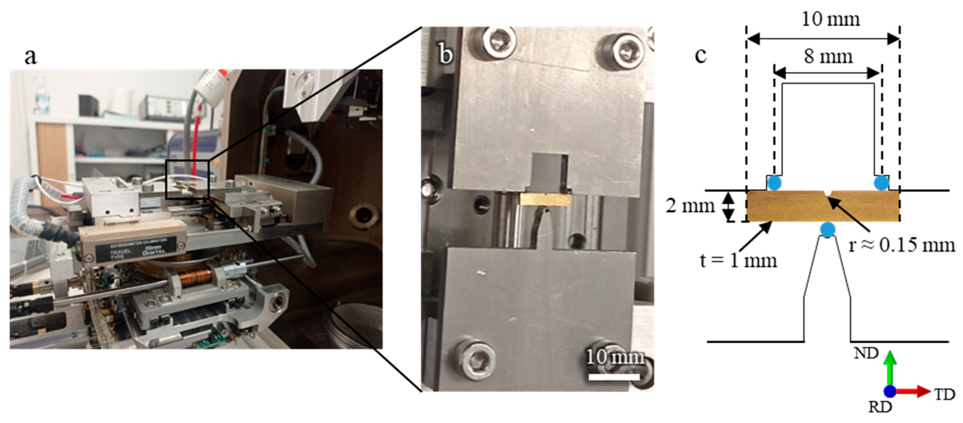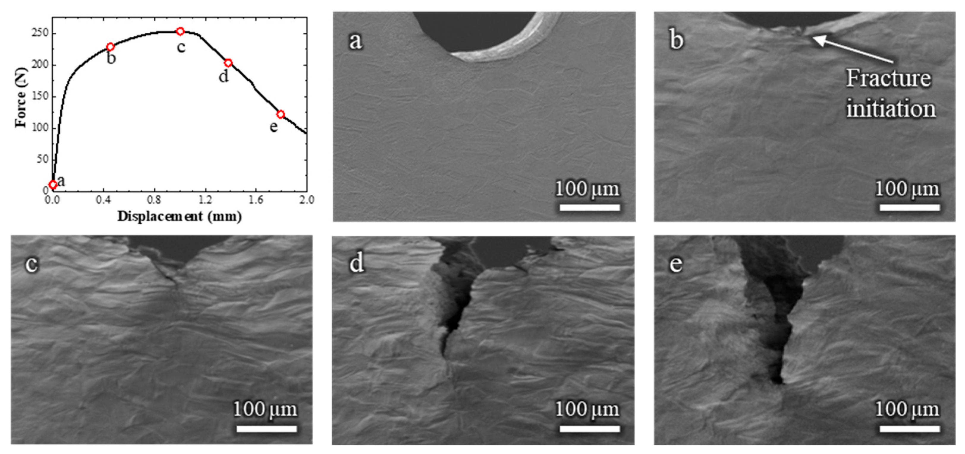 Figure 2b,c shows that, during plastic deformation, the grains exhibited considerable elongation in the tensile stress direction, which corresponds to the TD direction in Figure 1. Moreover, the force–displacement curve (Figure 2a) shows the strain hardening typical of FCC solid solution alloys. The fracture of the Cu-30%Zn sample initiated at a displacement of 0.45 mm (Figure 2b). At this stage, the sample continues to exhibit a hardening behavior, as the crack is small compared to the volume undergoing plastic deformation. The force only decreases after considerable fracture propagation (Figure 2c), after which the force continuously decreases while the fracture continues its propagation. The sample exhibited entirely ductile behavior throughout the test, characterized by slow fracture propagation and ductility dimples within the fracture; these latter are more clearly visible on the fracture surface in Figure A1 (Appendix A).