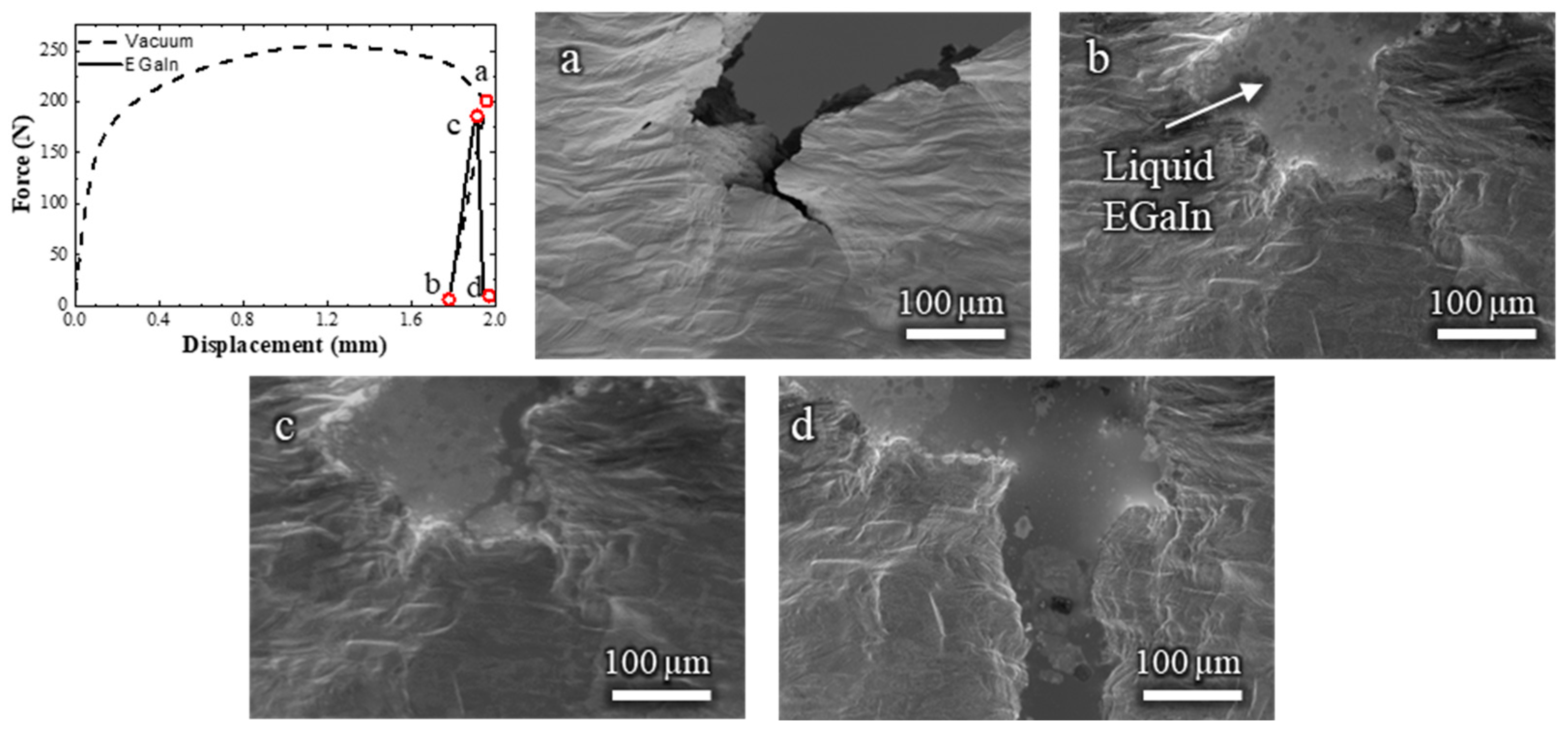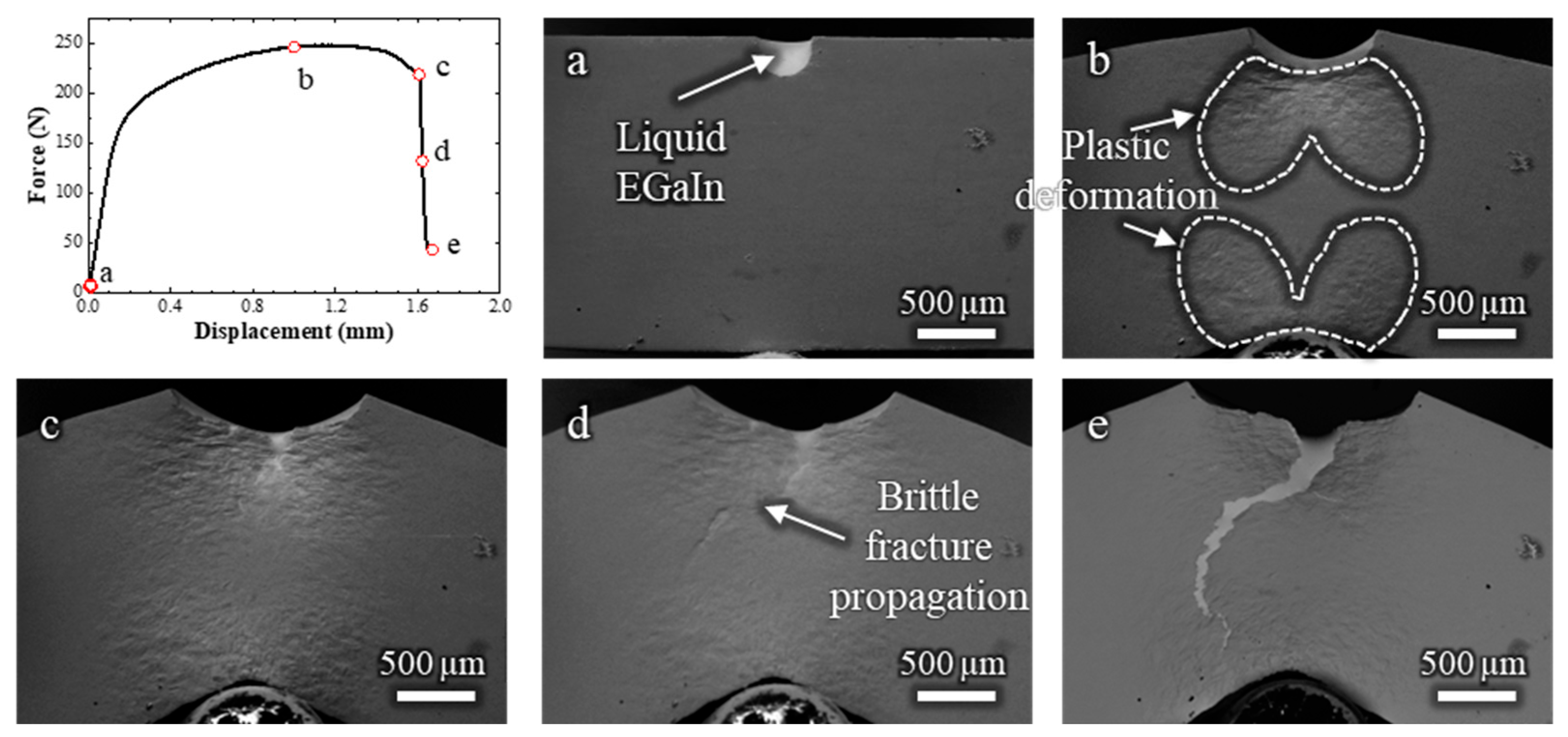 Immediately after crack initiation, the liquid EGaIn follows the crack opening by capillary, and continues to do so as the crack advances. Between 1.28 and 1.89 mm of displacement (Figure 3c,d), the fracture propagates in a ductile manner, as indicated by the gradual decrease in load and the steady crack propagation. This is followed by a sudden load drop and rapid crack propagation (Figure 3e), consistent with the occurrence of a brittle fracture due to the LME. By the end of the test, no liquid EGaIn remains in the original notch, as it has entirely drawn into the advancing crack, which extends beyond the field of view. Importantly, the mechanical behavior before the onset of the brittle fracture remained unaffected by the presence of the liquid metal. This confirms that embrittlement occurred only during the crack propagation stage, not during the initial plastic deformation.