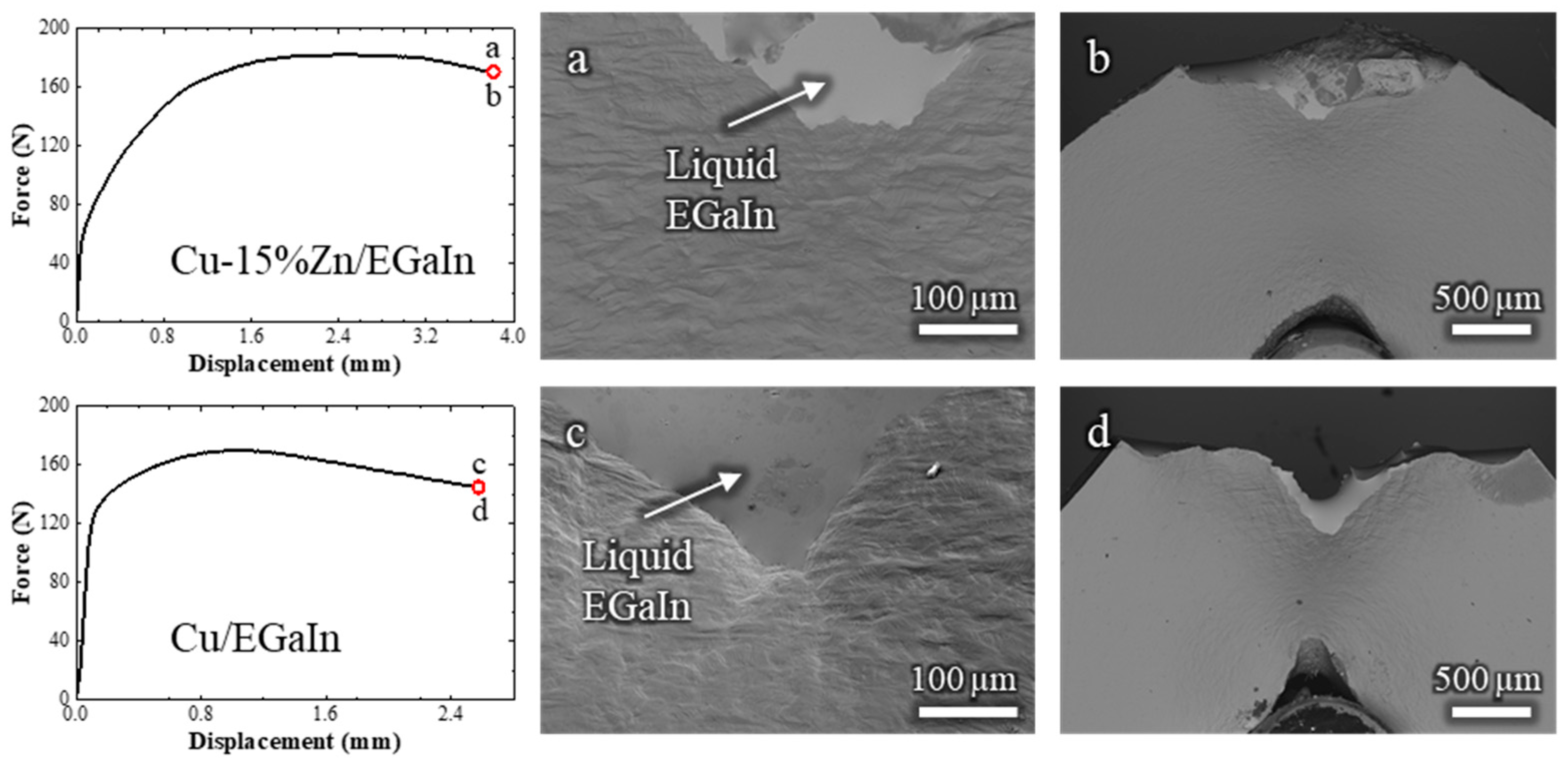 Figure 7. Load–displacement curves of Cu-15%Zn and pure Cu samples tested in contact with liquid EGaIn, accompanied by corresponding in situ SEM observations at the final stage of loading: (a,b) for Cu-15%Zn and (c,d) for pure Cu.