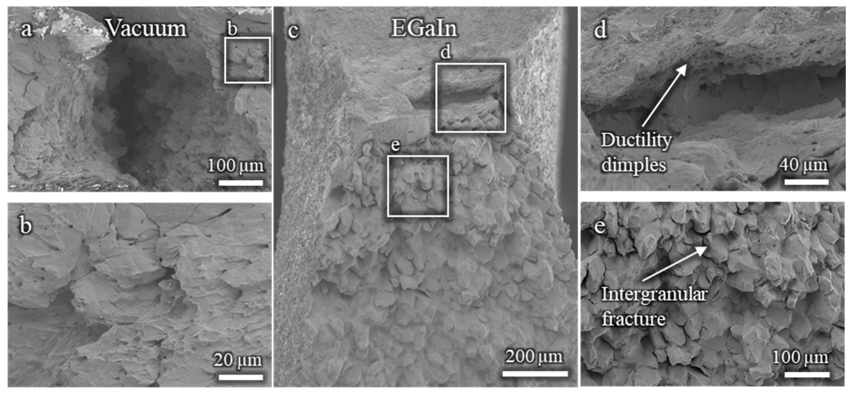 Figure A1. Fractographies of Cu-30%Zn samples tested using three-point bending: (a,b) without liquid EGaIn, showing ductile morphology; (ce) in contact with EGaIn, showing predominantly brittle intergranular fracture.
