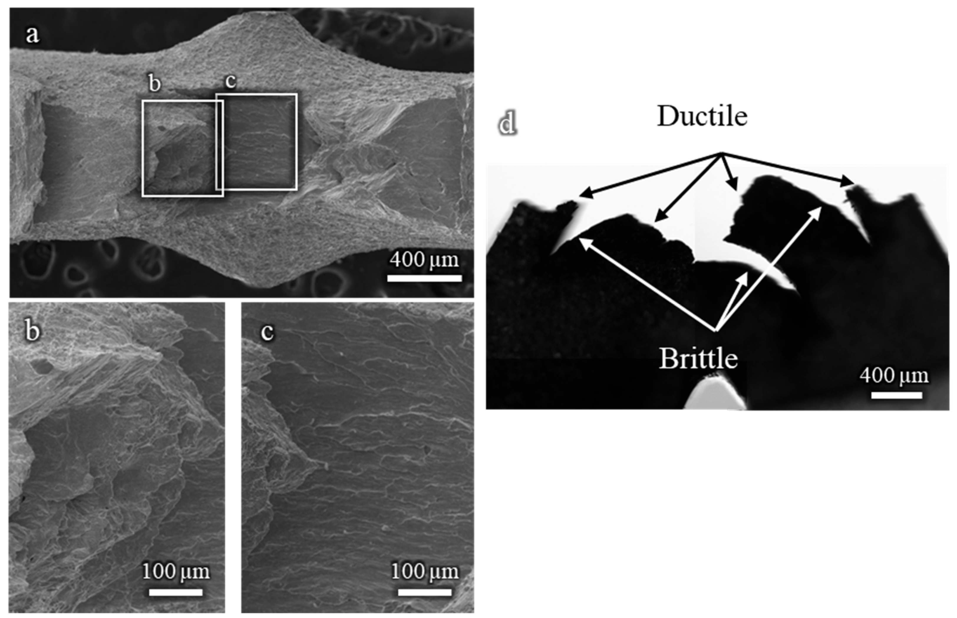 Figure A2. (ac) Fracture surfaces of a Cu-20%Zn sample tested in contact with EGaIn, showing alternating ductile and brittle regions. A transverse cut (d) highlights the directional propagation of each fracture mode.