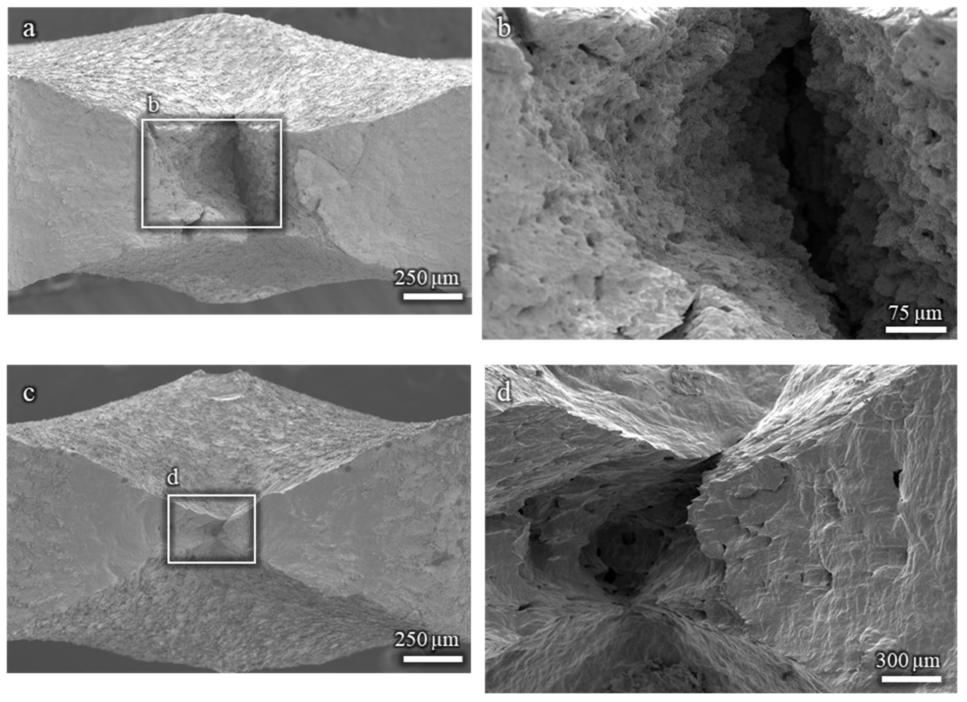 Figure A3. Fractographies showing ductile fracture surfaces: (a,b) Cu-15%Zn sample; (c,d) pure Cu sample. All tests were conducted in the presence of EGaIn.
