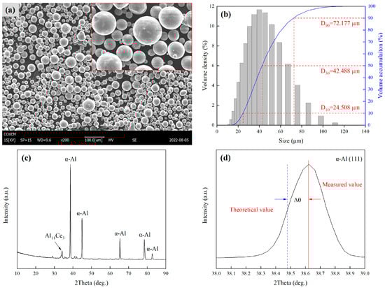 Representative characterization of the Al-3.0Ce-0.8Ca-1.9Mn pre-alloyed powder: (a) powder morphology; (b) particle size distribution histogram; (c) XRD spectrum; (d) enlarged XRD spectrum focusing on the diffraction peak associated with the α-Al (111) crystallographic plane.