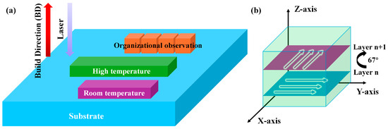 Three distinct alloy specimens were fabricated via the LPBF technique, with respective dimensions of 15 mm × 15 mm × 15 mm, 10 mm × 60 mm × 10 mm, and 20 mm × 80 mm × 10 mm. To ensure the purity of the deposited layers, an aluminum alloy plate with dimensions of 280 mm × 280 mm × 50 mm was employed as the substrate. Prior to experimentation, the substrate surface was meticulously polished using a graded series of sandpapers ranging from #400 to #1200 to eliminate the surface oxide layer. Subsequently, the substrate underwent ultrasonic cleaning in anhydrous ethanol for 5 min to thoroughly remove surface oils and other contaminants. To further optimize the quality of the formed components, the pre-treated substrate was preheated to 80 °C prior to the LPBF process. The specific parameters of the LPBF forming process are detailed in Table 2. During the forming process, a 67° interlayer rotation scanning strategy was implemented (as depicted in Figure 2). This strategy, which modifies the laser scanning direction between adjacent layers, effectively mitigates the anisotropy of the alloy and averts the concentrated distribution of metallurgical defects [22]. During the experimental process, to effectively prevent the loss of low-melting-point metals (such as Mn) due to high-temperature evaporation, the entire preparation procedure was conducted under a high-purity argon (Ar) protective atmosphere.