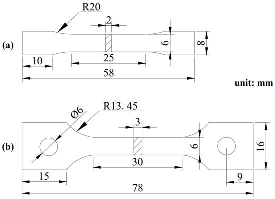 Specimens for room-temperature and high-temperature tensile property tests were prepared using electrical discharge machining (EDM), with their specific dimensions illustrated in Figure 3a and Figure 3b, respectively. The surfaces of the specimens were meticulously polished using #600, #1200, and #2400 water-abrasive sandpapers to ensure surface smoothness. Tensile property tests were conducted on an E45.305 electronic universal testing machine (MTS Systems Corporation, Eden Prairie, MN, USA), with a constant tensile rate of 0.5 mm/min. During the testing process, a RVX-112 optical extensometer (Nanjing Ruize Meso-Micro Testing Technology Co., Ltd., Nanjing, China) was employed to measure strain in real-time, ensuring the accuracy and reliability of the data.