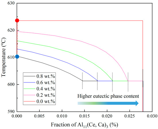 Figure 4 demonstrates the effect of varying Ca content (x = 0.1–1.0 wt.%) on the eutectic precipitation temperature of the Al11(Ce, Ca)3 phase within the Al-3.0Ce-xCa alloy system. Thermodynamic simulations conducted using the Pandat software revealed a descending trend in the eutectic precipitation temperature of the Al11(Ce, Ca)3 phase with increasing Ca content. Specifically, when the Ca content increased from 0.0 wt.% to 0.2 wt.%, the eutectic precipitation temperature of the Al11(Ce, Ca)3 phase started to decrease gradually. Given the rapid melting and solidification characteristics inherent to the LPBF process, the reduction in eutectic precipitation temperature aids in maintaining a consistent volume fraction of precipitates during alloy formation. As the Ca content further increased to 0.4–0.8 wt.%, the eutectic precipitation temperature of the Al11(Ce, Ca)3 phase continued to decline. At a Ca content of 0.8 wt.%, the eutectic precipitation temperature of the Al11(Ce, Ca)3 phase reached its minimum value of 610 °C. In summary, as the Ca content increased from 0.0 wt.% to 0.8 wt.%, the eutectic precipitation temperature of the Al11(Ce, Ca)3 phase demonstrated a consistent and progressive decline from 623 °C to 610 °C, resulting in a cumulative reduction of 13 °C. This observed decrease in the transformation temperature is predominantly ascribed to the incorporation of Ca, which fundamentally alters the eutectic reaction dynamics within the Al-Ce-Ca ternary system. This modification consequently disrupts the thermodynamic stability of the Al11(Ce, Ca)3 phase. Moreover, the solid solution behavior of Ca induces lattice distortion, which exerts a pronounced influence on the nucleation and growth kinetics of the eutectic phase. Consequently, an increase in Ca content correlates with a corresponding elevation in the volume fraction of the eutectic phase. These simulation outcomes furnish critical theoretical insights for the optimization of alloy composition, aimed at effectively lowering the eutectic transformation temperature. Based on these empirical findings, the optimal Ca content range for the design of Al-3.0Ce-xCa-yMn alloys was ascertained to be 0.4–0.8 wt.%.