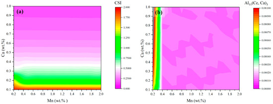 High-throughput computational results of the Al-3.0Ce-xCa-yMn alloy: (a) CSI; (b) volume fraction of the Al11(Ce, Ca)3 phase.