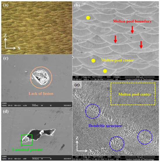 Microstructural characteristics of the as-printed Al-3.0Ce-0.8Ca-1.9Mn alloy: (a) optical microstructure photograph; (b–d) SEM images; (e) melt pool morphological features of the XZ cross-section.