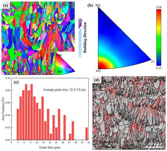 The EBSD results of the Al-3.0Ce-0.8Ca-1.9Mn alloy: (a) the grain orientation distribution map; (b) the inverse pole figure; (c) the histogram of grain size distribution; and (d) the map of high-angle and low-angle grain boundaries, where black lines represent high-angle grain boundaries (HAGBs, ≥10°) and red lines denote low-angle grain boundaries (LAGBs, 2°–10°).