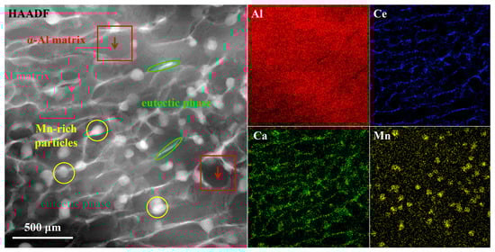 Figure 8 presents the high-angle annular dark-field (HAADF) image of the Al-3.0Ce-0.8Ca-1.9Mn alloy alongside the corresponding energy-dispersive X-ray spectroscopy (EDS) analysis results. The HAADF image revealed a characteristic eutectic microstructure, consisting of alternating dark matrix regions and bright strip-like secondary phases. Furthermore, a significant number of spherical particles were observed along the interfaces of the secondary phases and within the matrix. The eutectic region exhibited a relatively coarse microstructure, which was primarily attributed to the reduced solidification rate at the melt pool boundaries and the in situ heat treatment effect during subsequent processing [25]. EDS analysis demonstrated a substantial overlap in the distribution of Ca and Ce, indicating that the eutectic region was predominantly composed of Al-Ce-Ca ternary eutectic compounds. In contrast, Mn was primarily dissolved in the α-Al matrix, with minimal segregation observed, forming Mn-rich regions. These Mn-rich regions, in conjunction with Al, gave rise to the formation of relatively large and densely distributed AlMn particles.