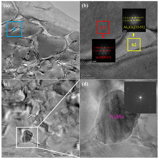 To further elucidate the composition of the Al-Ce-Ca ternary eutectic compounds, TEM analysis was performed, as illustrated in Figure 9. Utilizing high-resolution imaging and the corresponding Fourier transform patterns, the lattice spacings and interplanar angles were meticulously measured and cross-referenced with the standard PDF database. The matrix region (highlighted in red in Figure 9b) was identified as face-centered cubic (fcc) α-Al, aligned along the [0–11] zone axis. The ternary eutectic compound (highlighted in yellow in Figure 9b) was characterized as an orthorhombic body-centered lattice Al11(Ce, Ca)3 phase, oriented along the [13–51] zone axis. The incorporation of Ca primarily involved the substitution of Ce atoms within the Al11Ce3 phase, leading to the formation of the Al11(Ce, Ca)3 binary intermetallic solution. This substitution mechanism significantly enhanced the volume fraction of the eutectic phase, thereby contributing to the overall microstructural evolution of the alloy. The analysis of selected area electron diffraction (SAED) spots further confirmed that the crystal structure of the Al-Mn particles corresponded to the Al6Mn phase, with an average size of approximately 100 nm (as shown in Figure 9c,d).